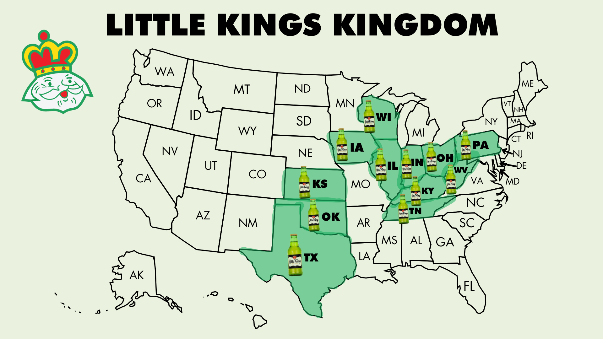 Little Kings is currently available in 12 states: Ohio, Kentucky, Indiana, Illinois, Pennsylvania, Tennessee, West Virginia, Wisconsin, Iowa, Kansas, Oklahoma & Texas.